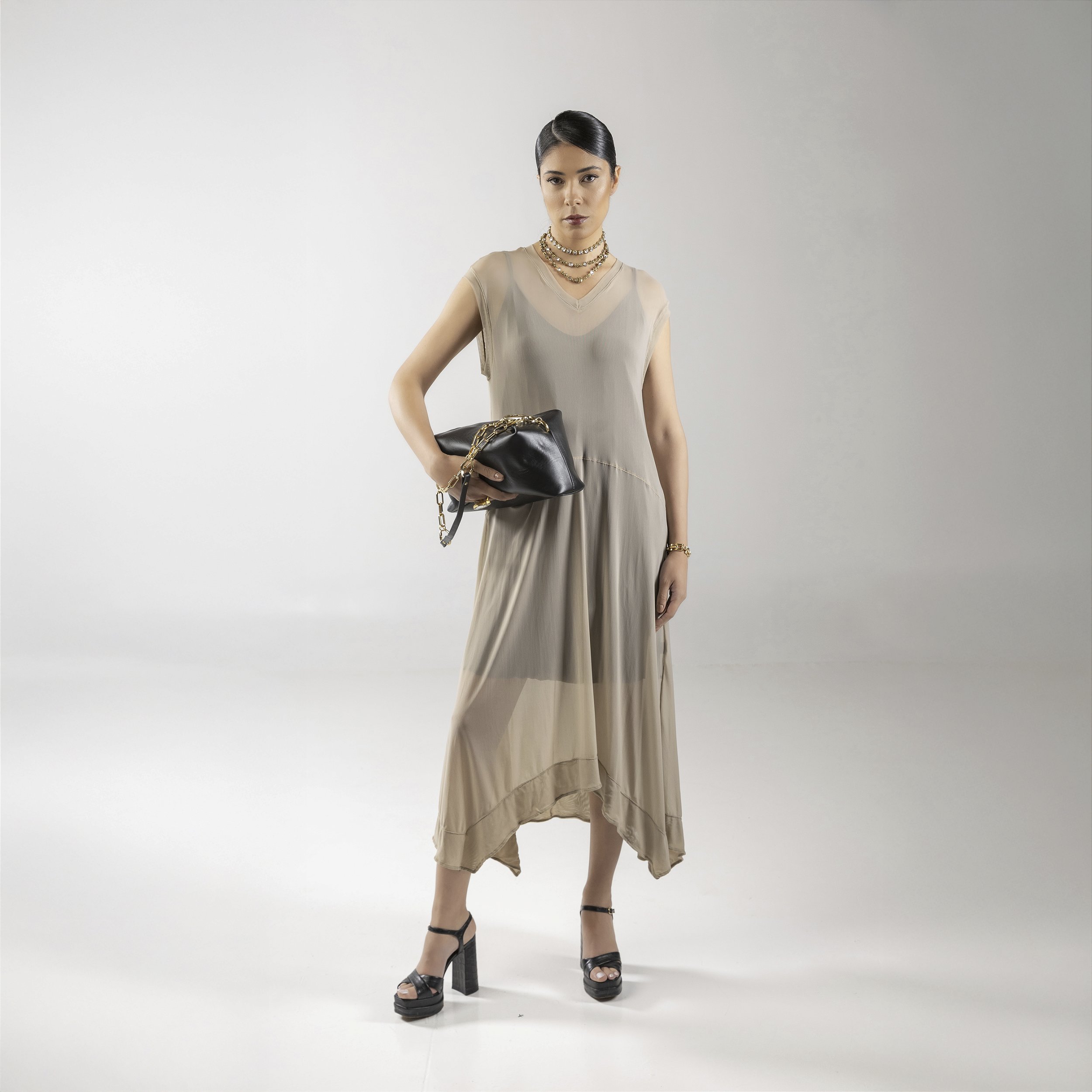 Vestido em tule leve com anágua, caimento fluido e barra assimétrica em formato meia-lua. Um modelo sofisticado, confortável e perfeito para produções elegantes.